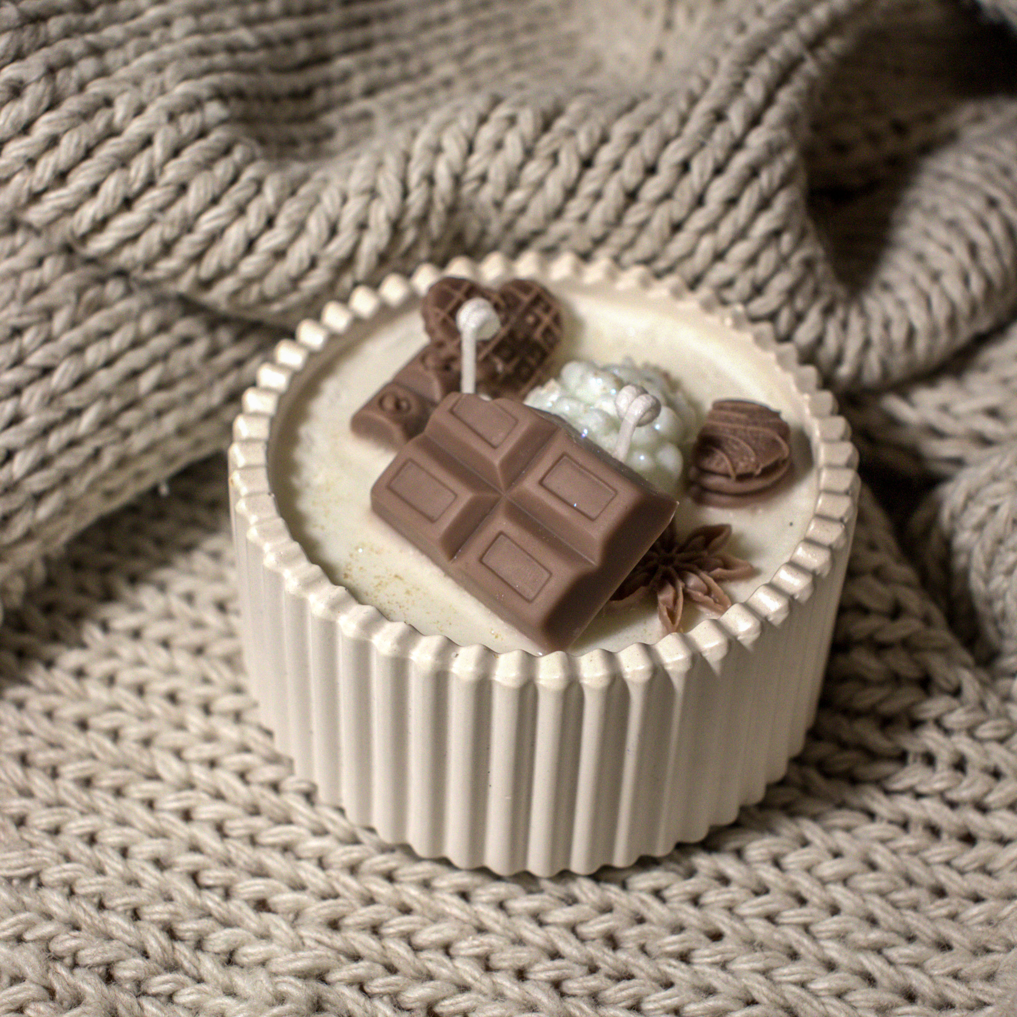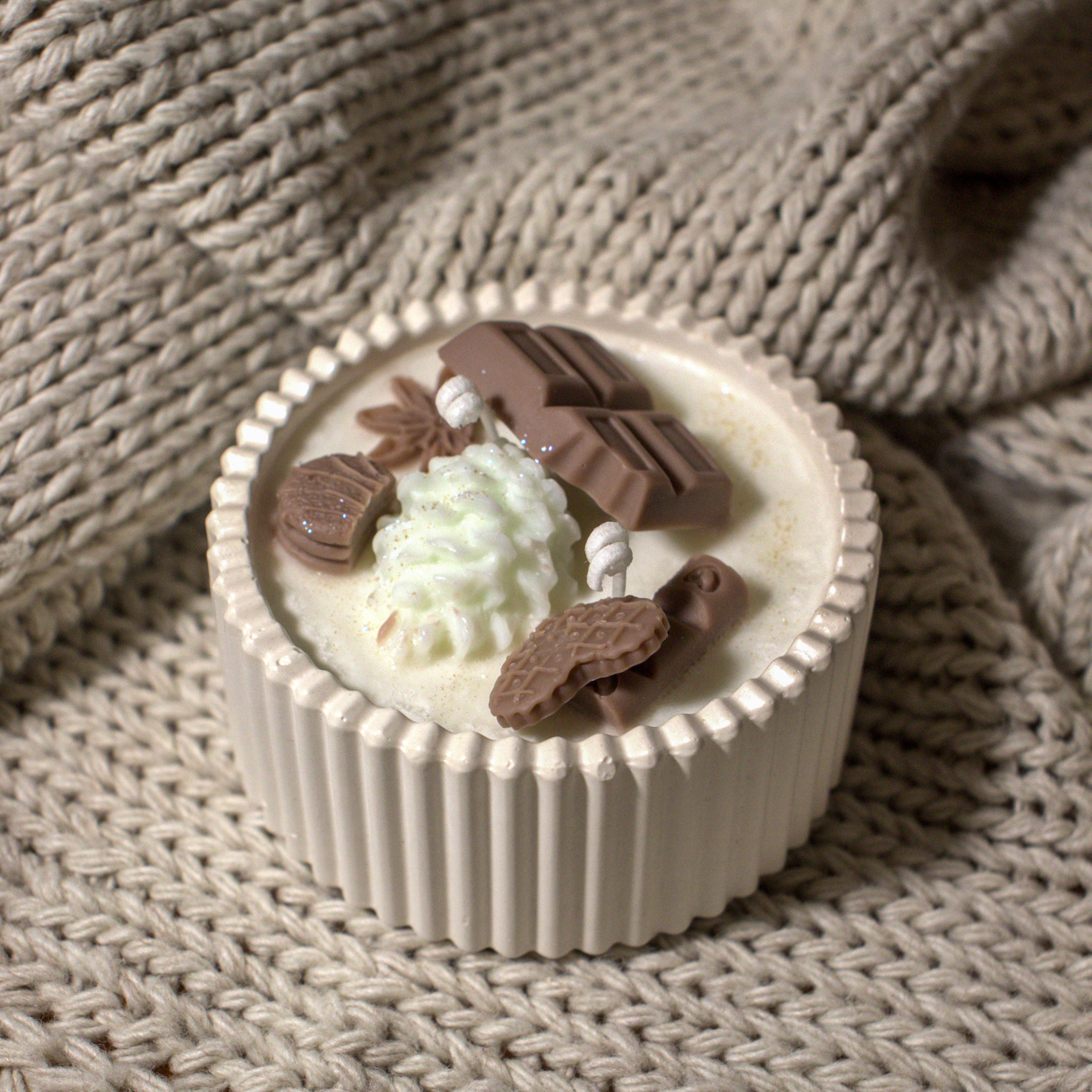 Ez a 8×8×4 cm-es sütigyertya játékos, meleg és otthonos hangulatot visz a térbe. A kerámiatálban különböző szójaviasz díszítések jelennek meg – csokoládé kockák, falatok, roládok, habrózsák, golyócskák vagy más édes, díszes elemek. A gyertya úgy néz ki, mintha egy friss, illatos desszert lenne a tálban, csak itt minden apró részlet viaszba öntve készül.